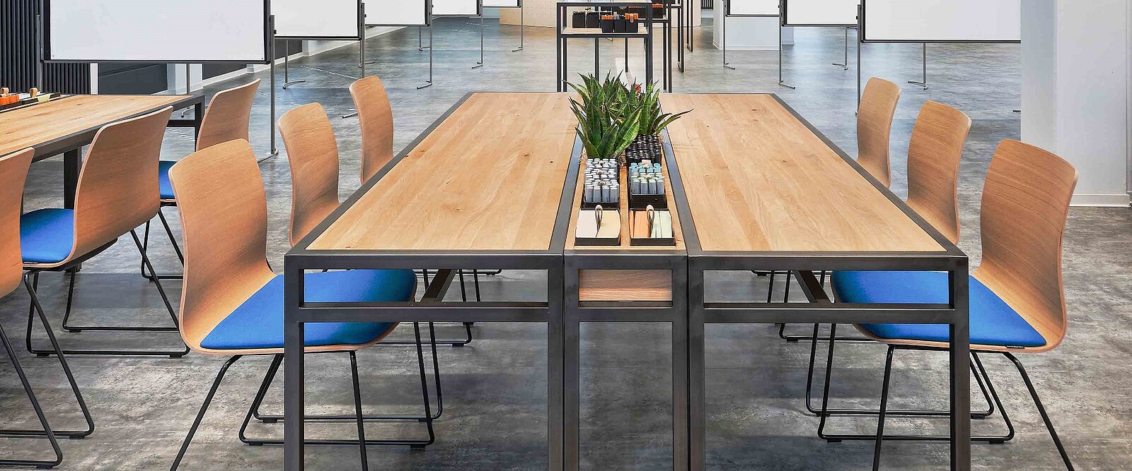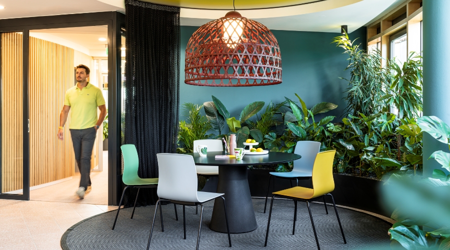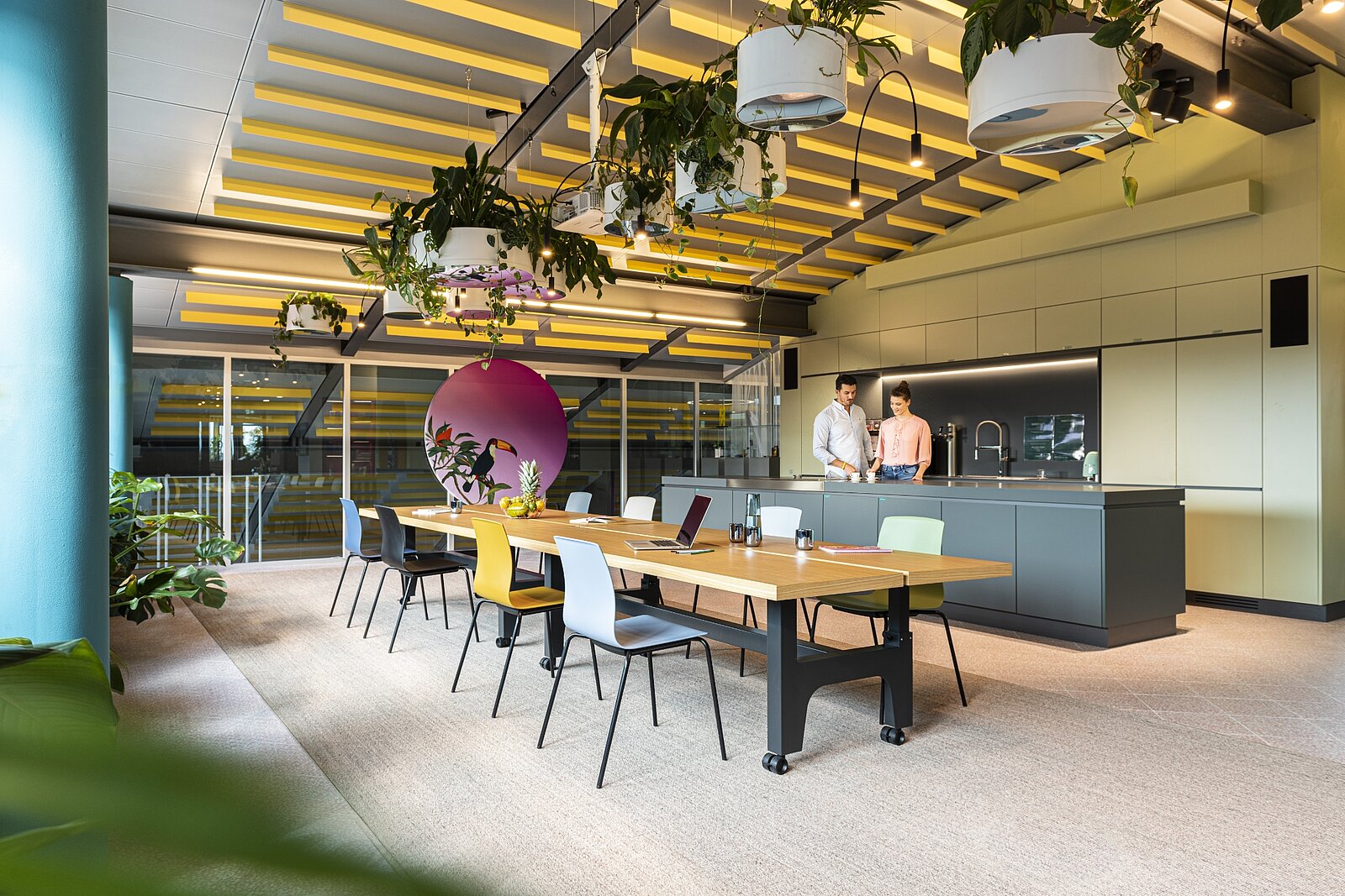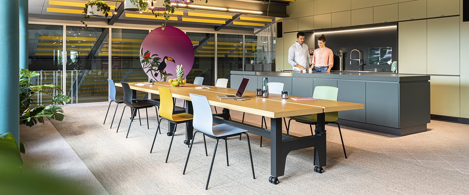 Let’s meet! Accanto alle classiche zone meeting negli uffici moderni vi sono anche zone pause, zone di reception e zone mensa oppure zone centrali per un veloce scambio tra colleghi e il lavoro quotidiano.