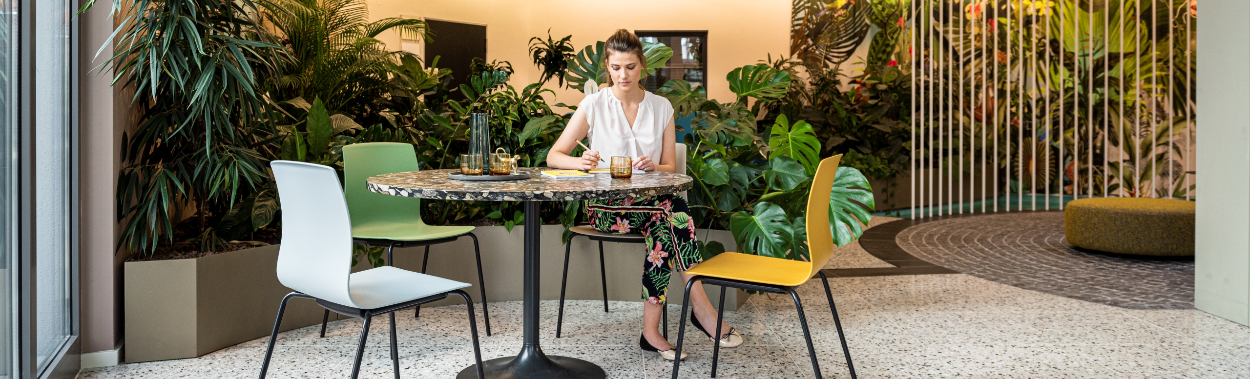Nelle mense e nelle zone centrali Fiore mostra tutta la sua versatilità come seduta a slitta, seduta con pattini, seduta a quattro gambe, ma anche come sgabello bar o seduta impilabile orizzontalmente. Essendo impilabile può essere riposto senza occupare troppo spazio.