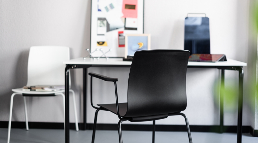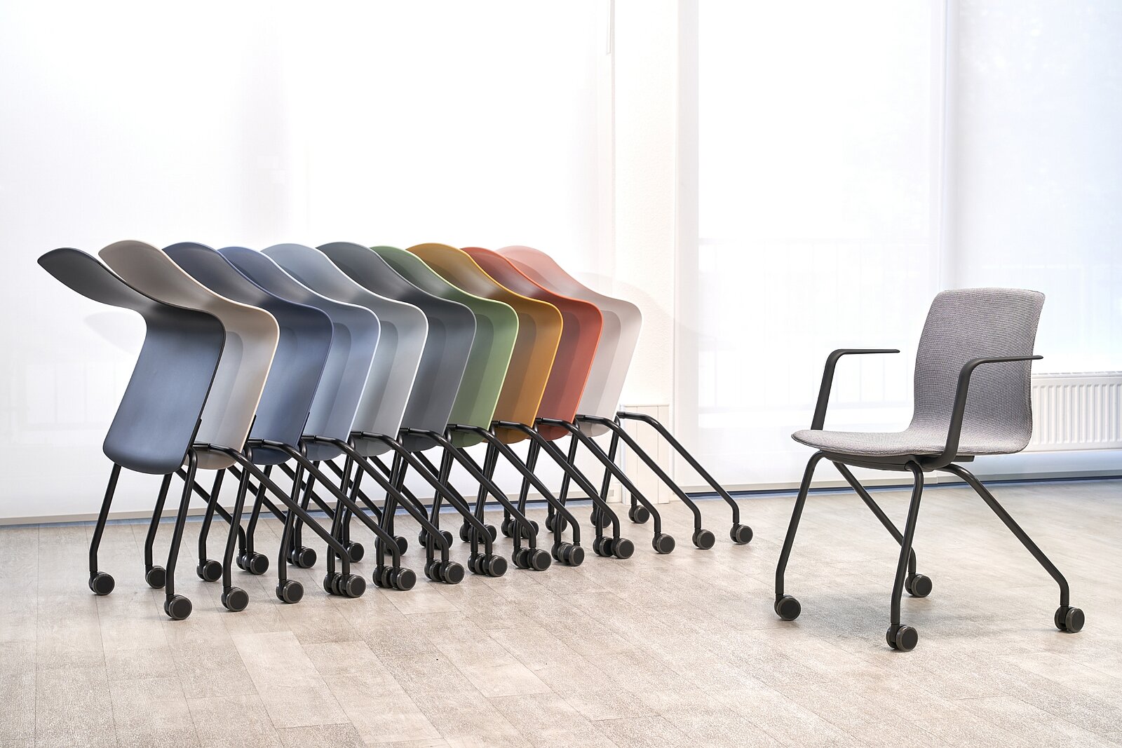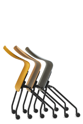 Fiore nesting si integra con la varietà di colori e materiali in qualsiasi ambiente lavorativo e anche nella versione con braccioli o pianetto di scrittura può essere impilata o riposta senza occupare troppo spazio.