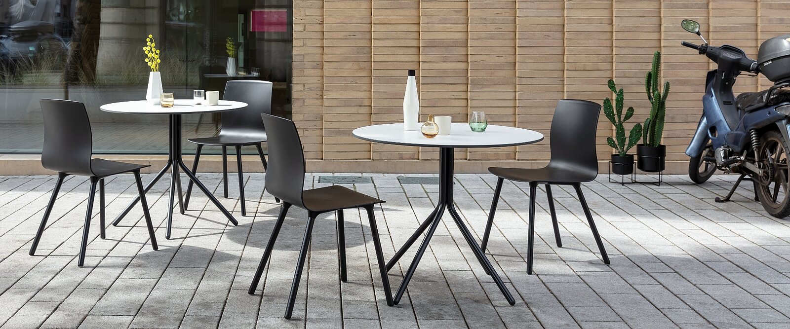 delle sedute e le monoscocche sedile/schienale di vari colori, per poi abbinarli ai tavoli per bistrot o ai tavoli alti.