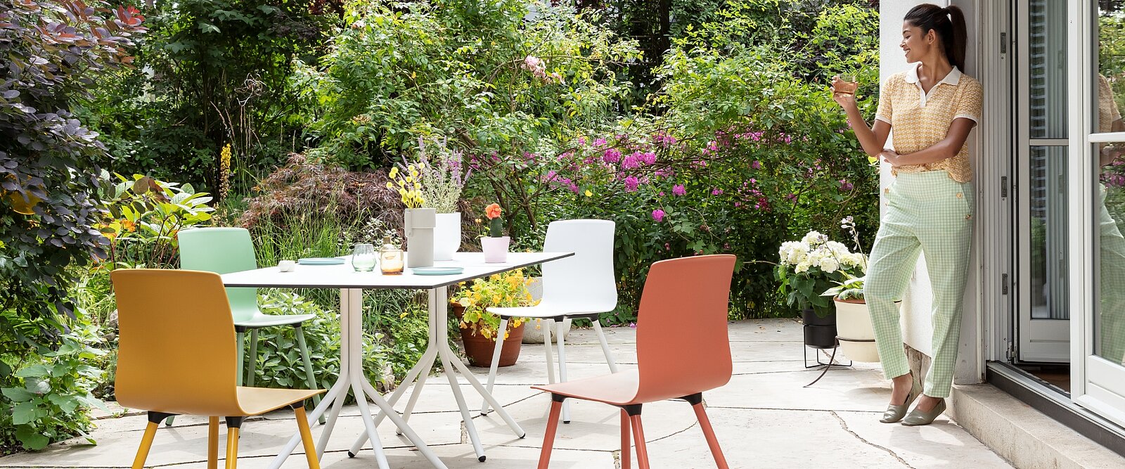 che riprende la forma di un fiore e i telai ricchi di varianti di queste pluripremiate sedute di design portano una ventata di aria fresca in qualsiasi ambiente esterno.