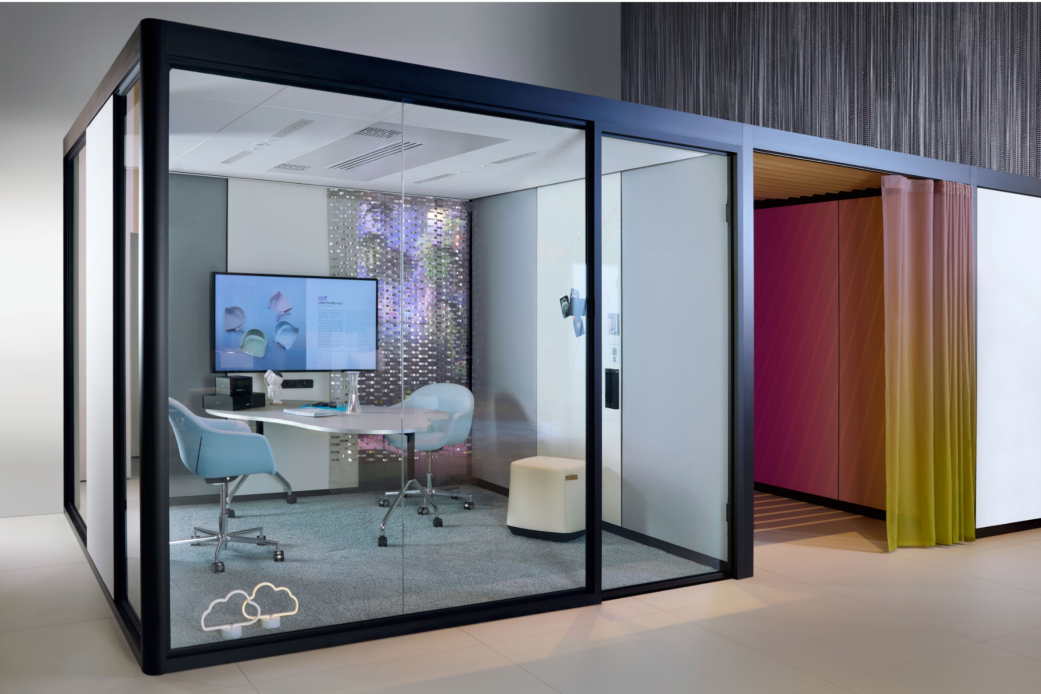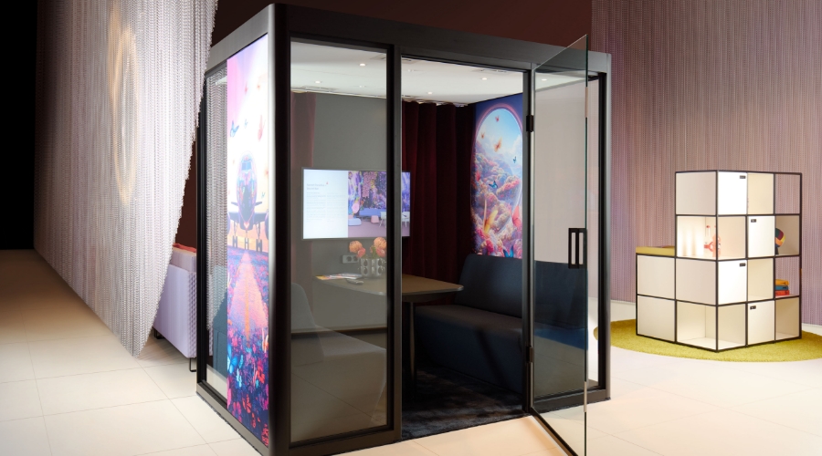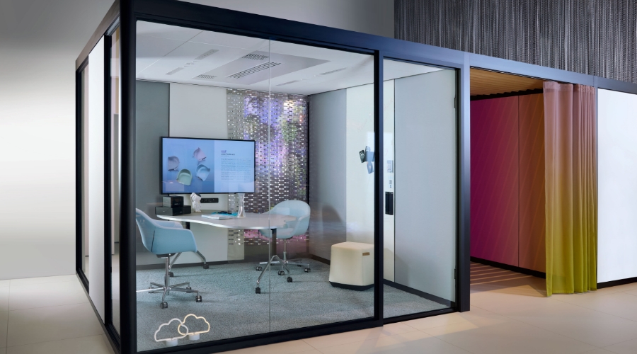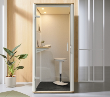 La soluzione spazio nello spazio può accogliere fino a quattro persone per colloqui riservati in un ambiente rarefatto e insonorizzato.