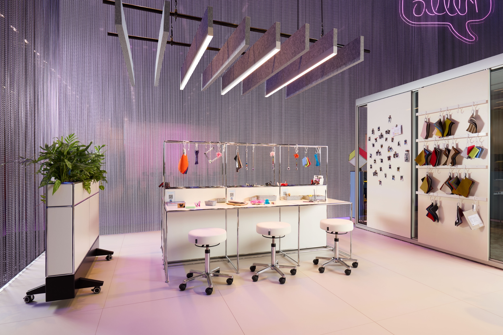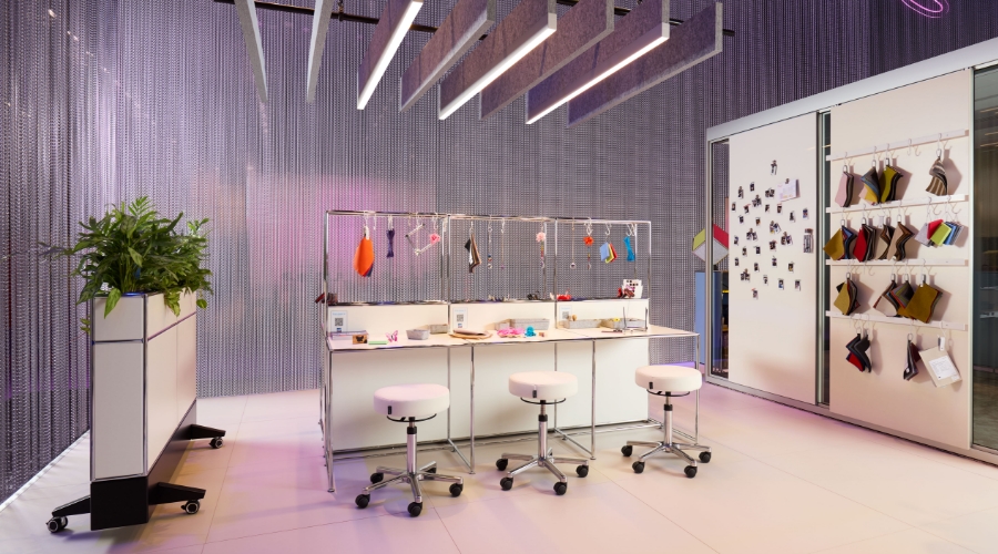 Il luogo della creatività e della scoperta. In modalità DIY, sul generoso bench modul space dal design minimalista bianco e cromo vengono sviluppate le prime idee dei prototipi.