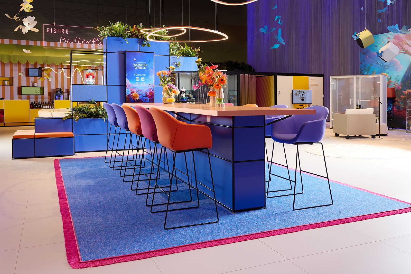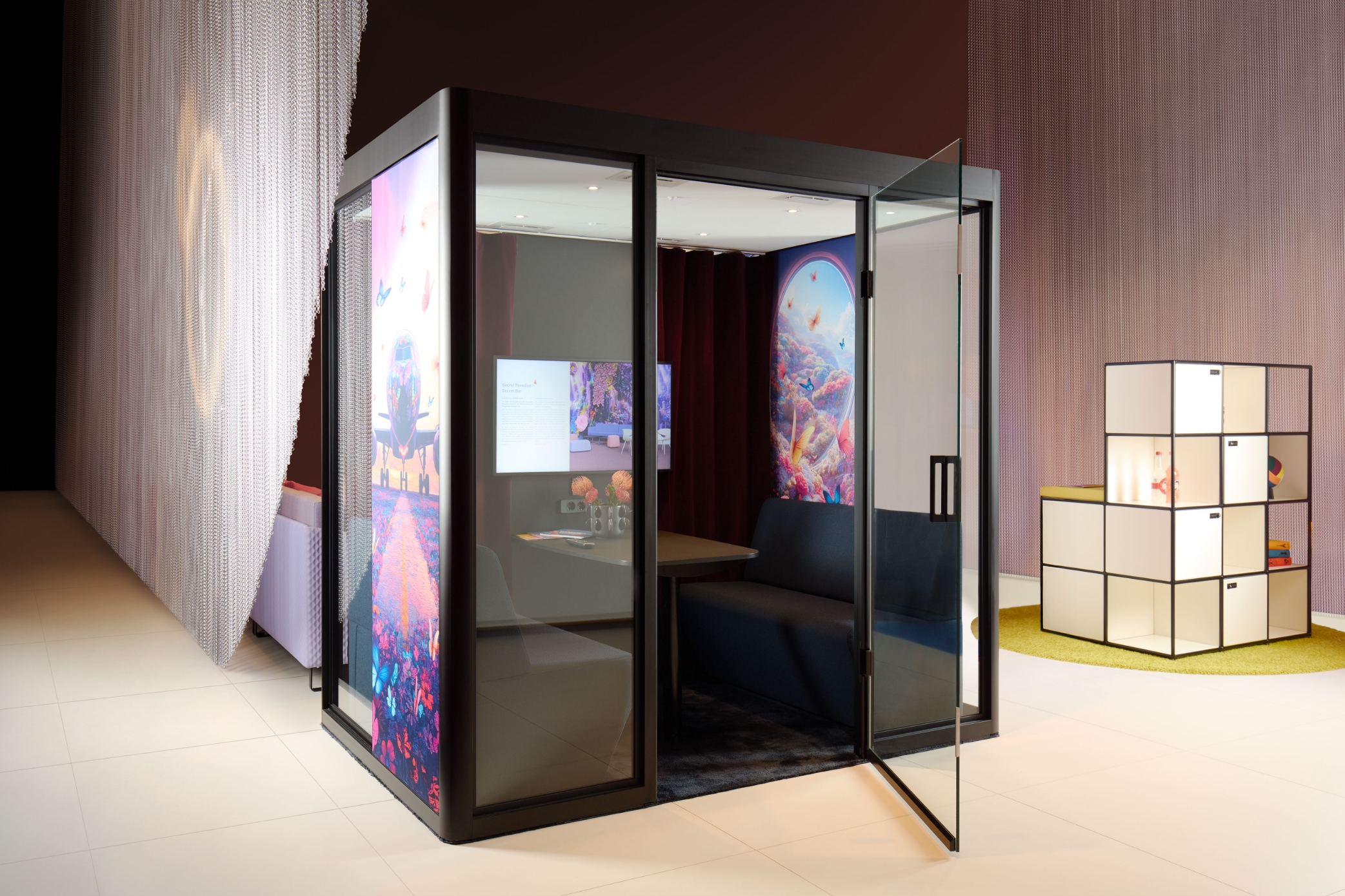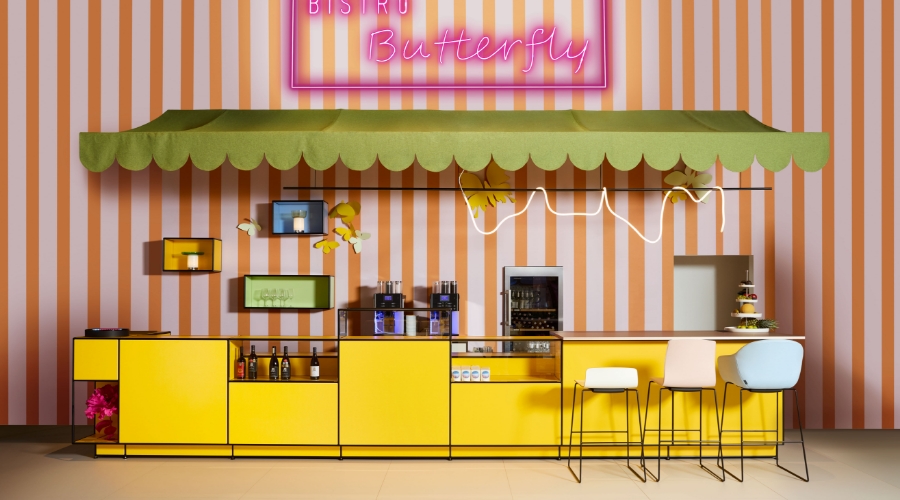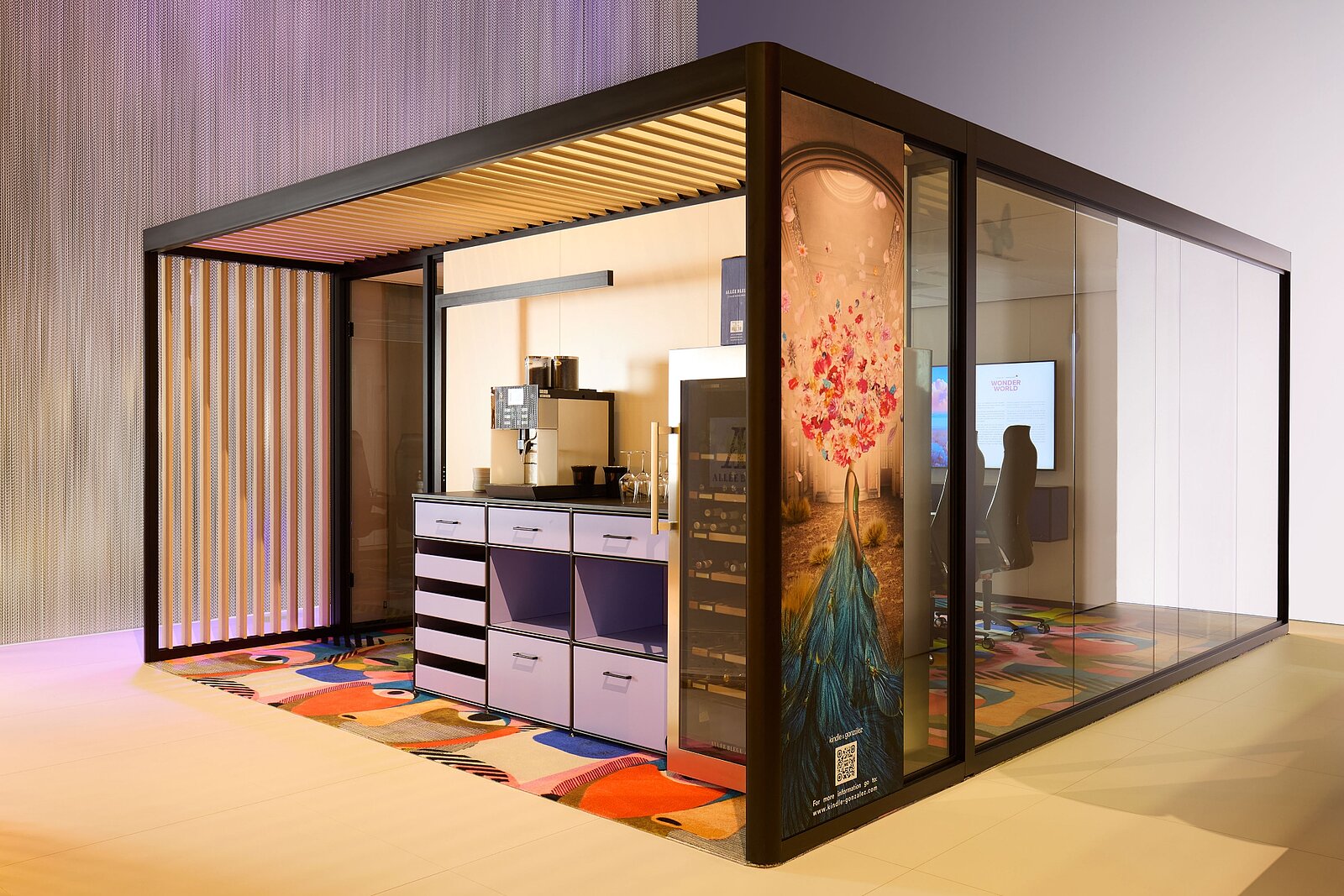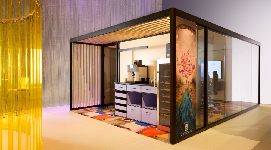 L’all inclusive boardroom cube nell’iconico stile Memphis funge da cornice esclusiva per riunioni di alto livello. L’angolo caffè/wine station modul space integrato nella pergola è un punto di ristoro immediato.