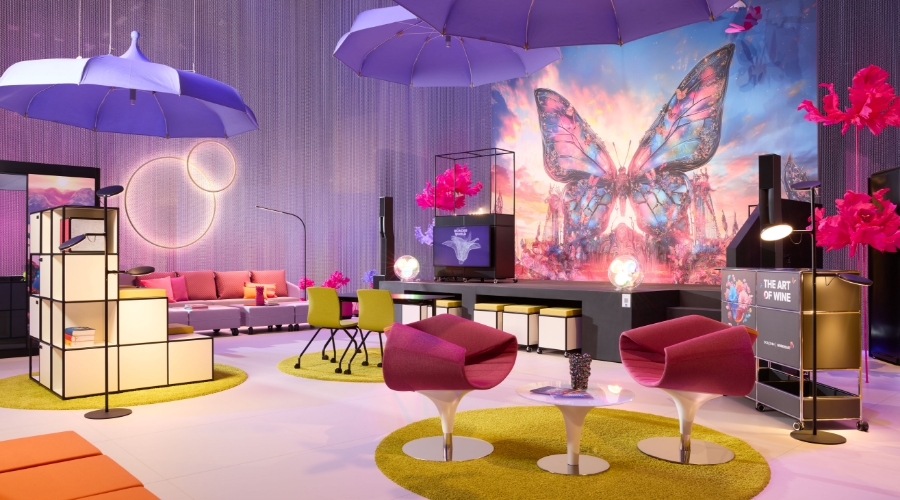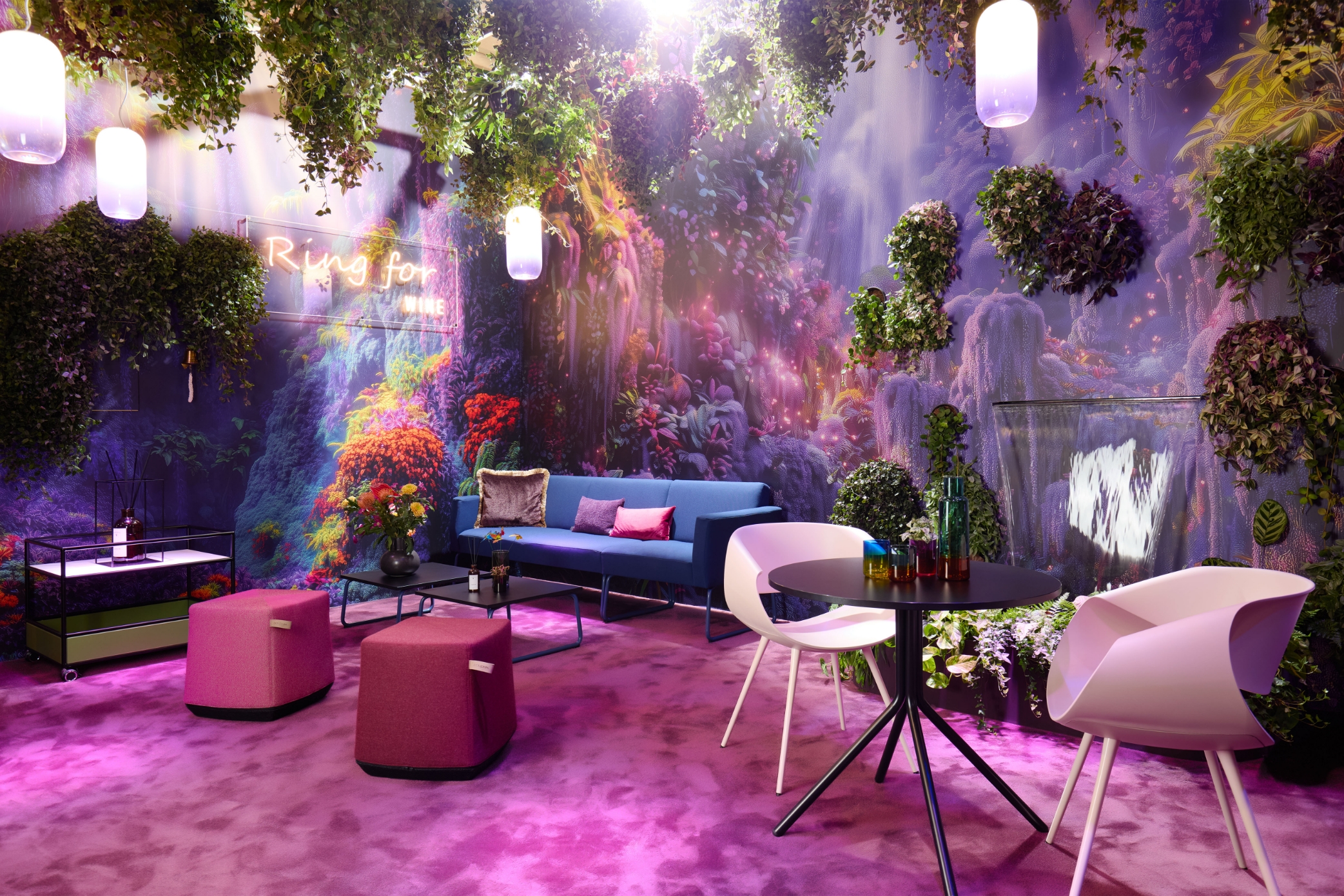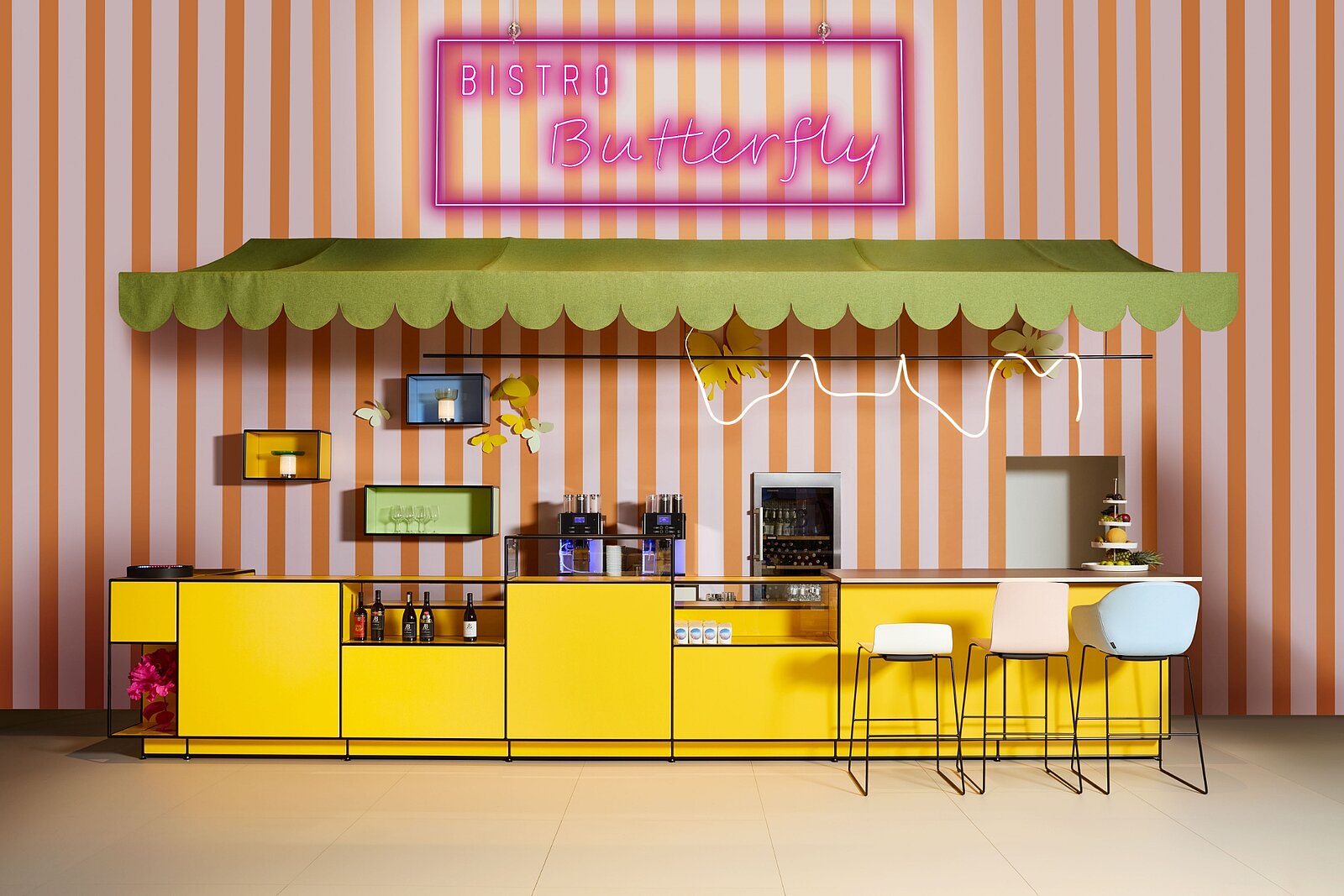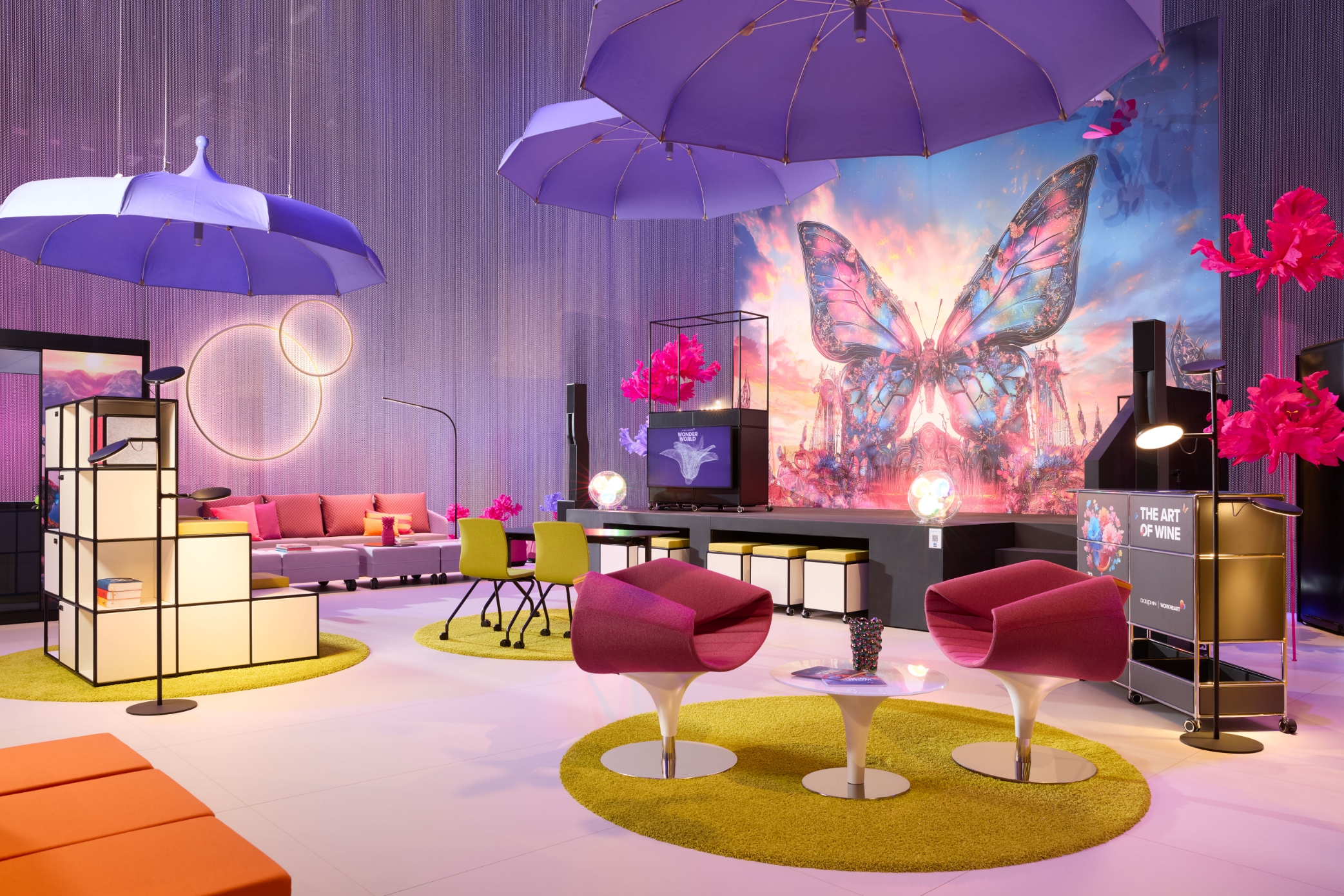 L’all inclusive boardroom cube nell’iconico stile Memphis funge da cornice esclusiva per riunioni di alto livello. L’angolo caffè/wine station modul space integrato nella pergola è un punto di ristoro immediato.