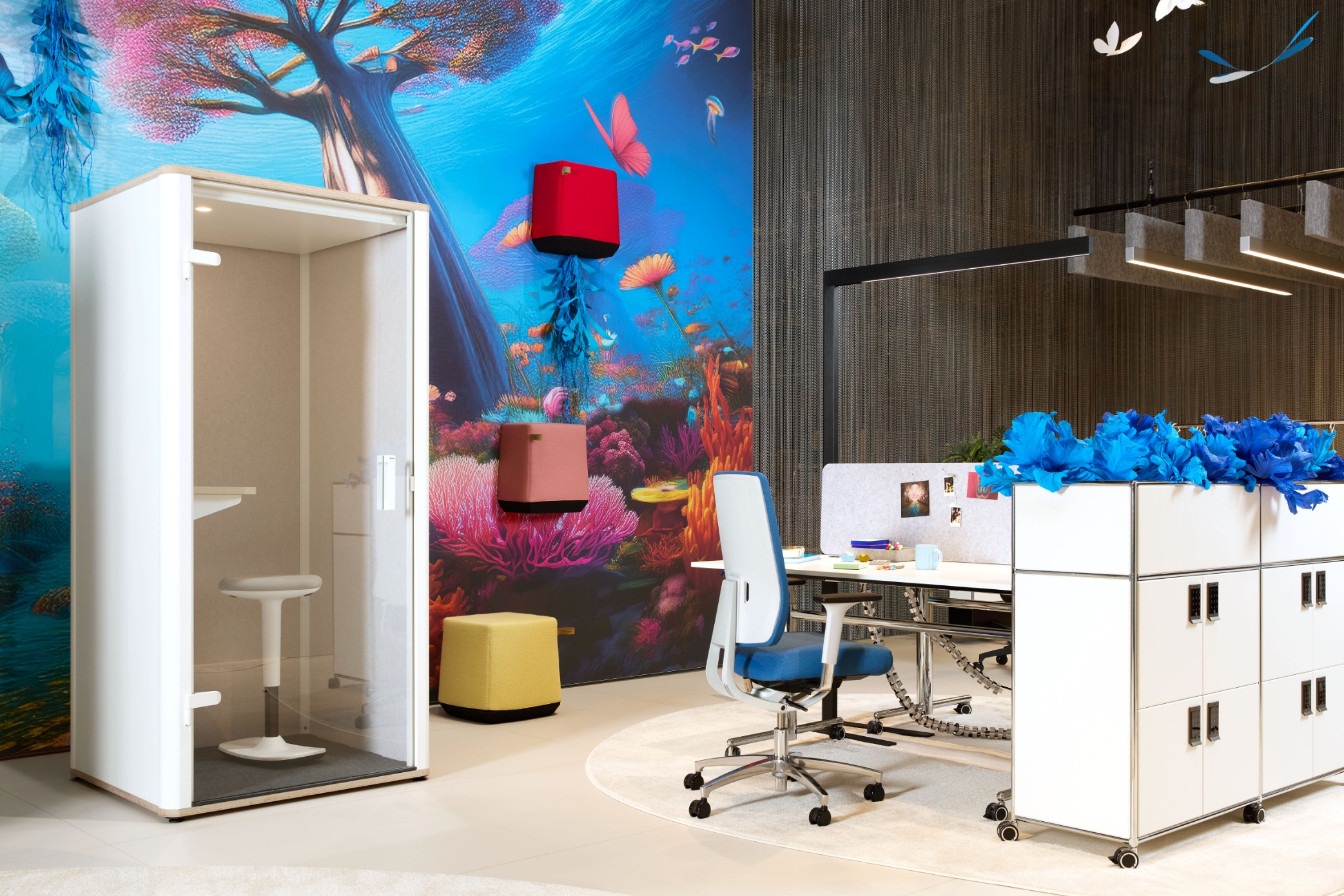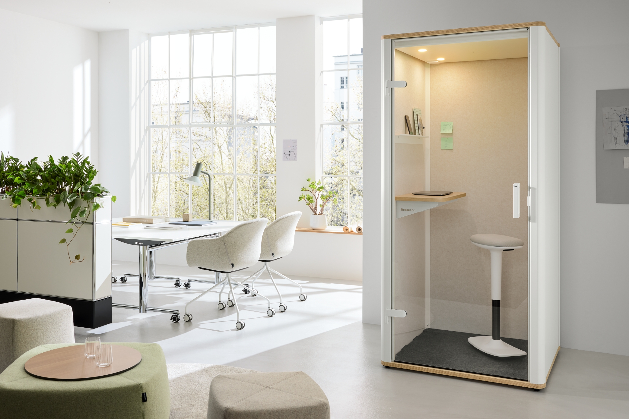 Realizzare in team le visioni, tenendo sempre a mente la sostenibilità. Tutti i mobili sono agili e su rotelle e possono essere facilmente risistemati. Per telefonate e colloqui riservati sono disponibili i cube bosselino uno e due di Bosse.
